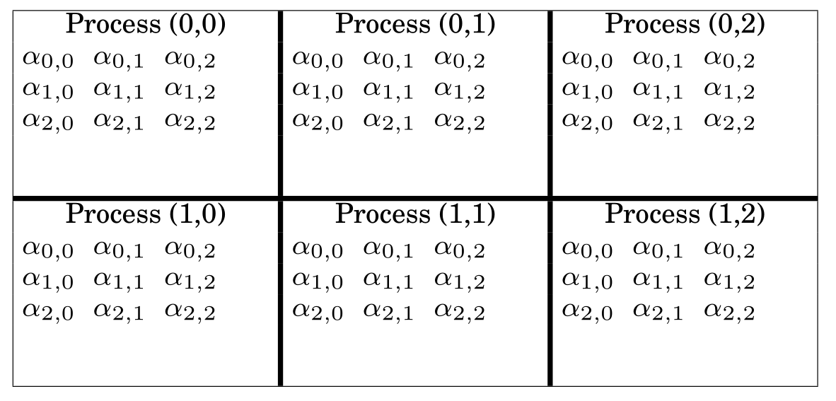Elemental for distributed dense linear algebra FLAME diagram for Cholesky $A[M_C, M_R]$ distribution The $A[,]$ distribution References Poulson et al. (2013) Elemental: A New Framework for Distributed Memory Dense Matrix Computations doi:10.1145⁄2427023.2427030 Previous Sparse and iterative linear algebra Next Orthogonality and Conditioning