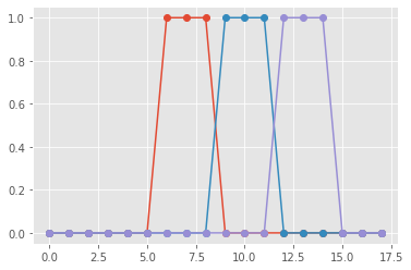 pyplot.plot(T[:6*cfactor,2:5], '-o');